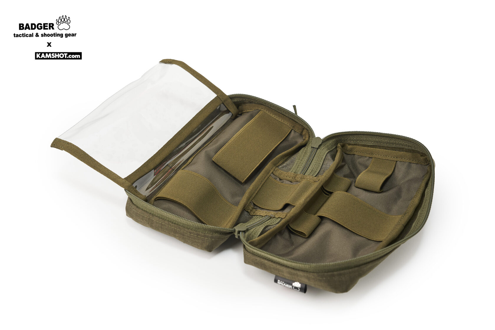 Kolejnym przydatnym elementem, który jest naszym pomysłem to przeźroczysta kieszonka na drobne elementy opatrunkowe jak plastry, płaskie opatrunki, sztuczne szwy, kartę poszkodowanego itd. Zazwyczaj w kompaktowych militarnych apteczki brakuje właśnie tego elementu a na treningach strzeleckich mikro urazy to najczęściej występujące obrażenia.