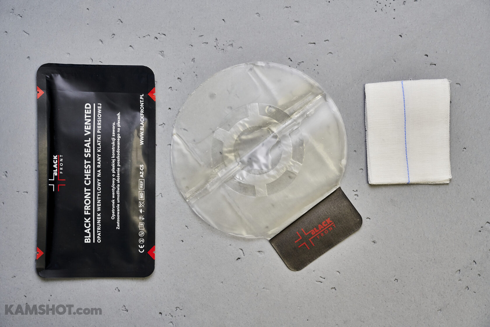 wewnątrz opakowania wraz z opatrunkiem wentylowym umieszczono również gazę, służącą do wstępnego oczyszczenia miejsca krwawienia z brudu, krwi i innych zanieczyszczeń