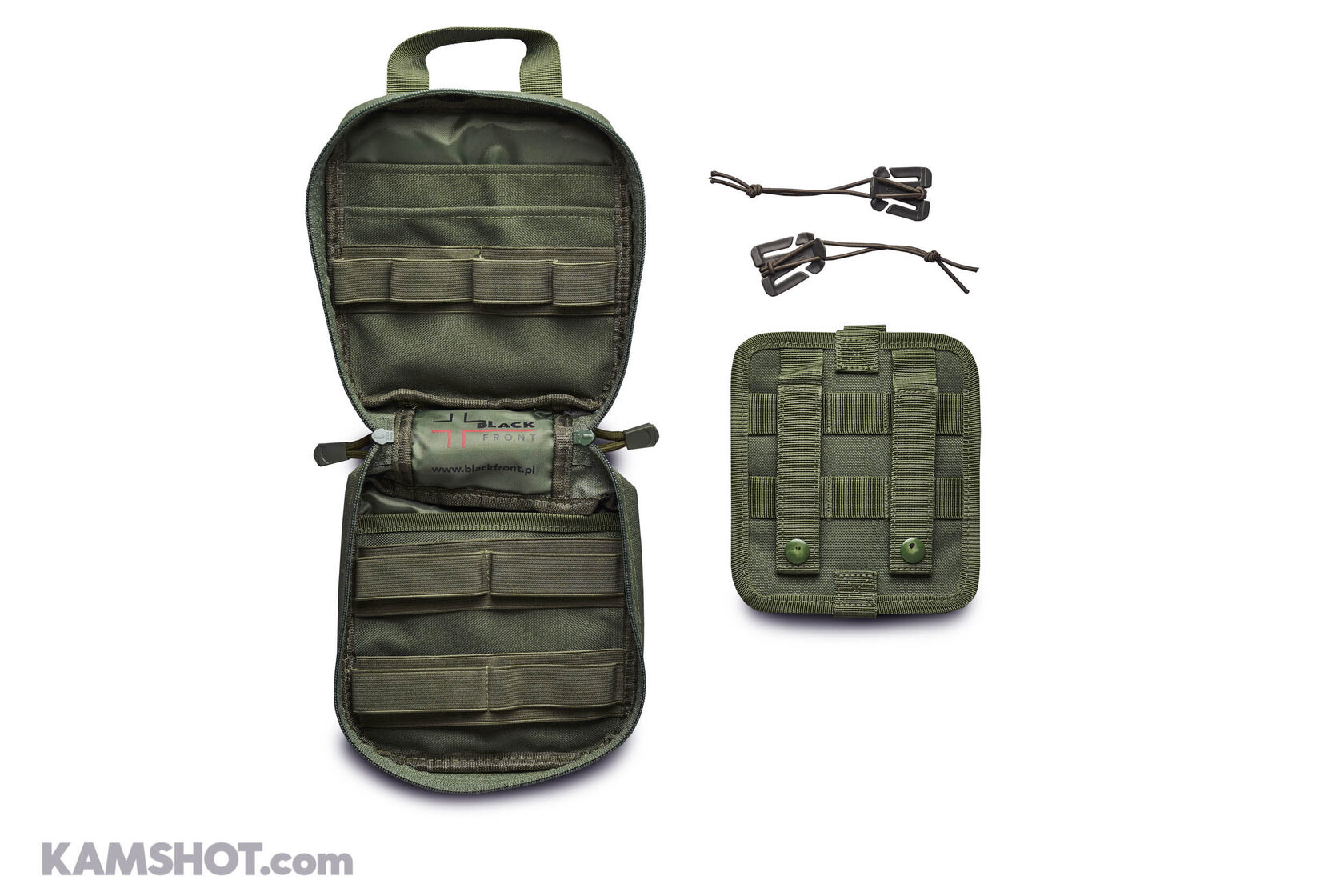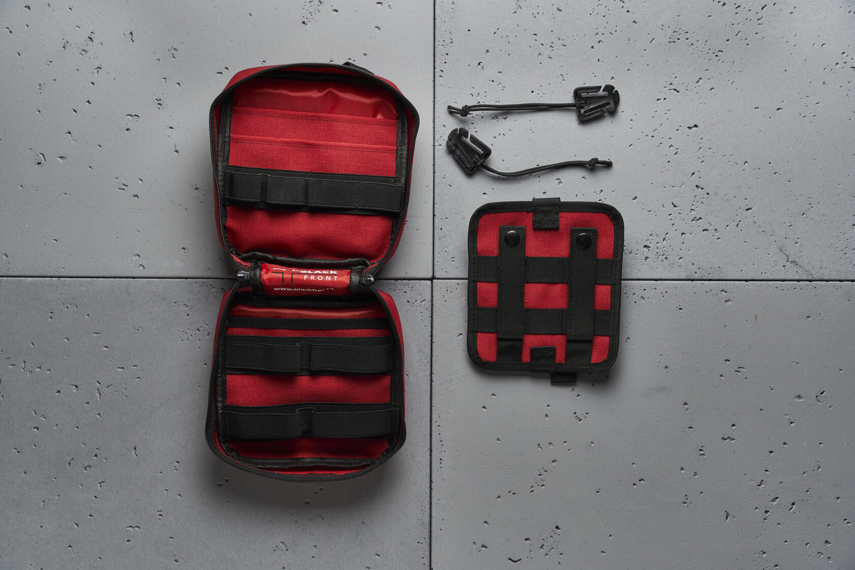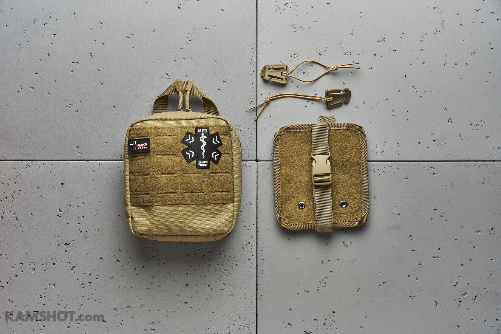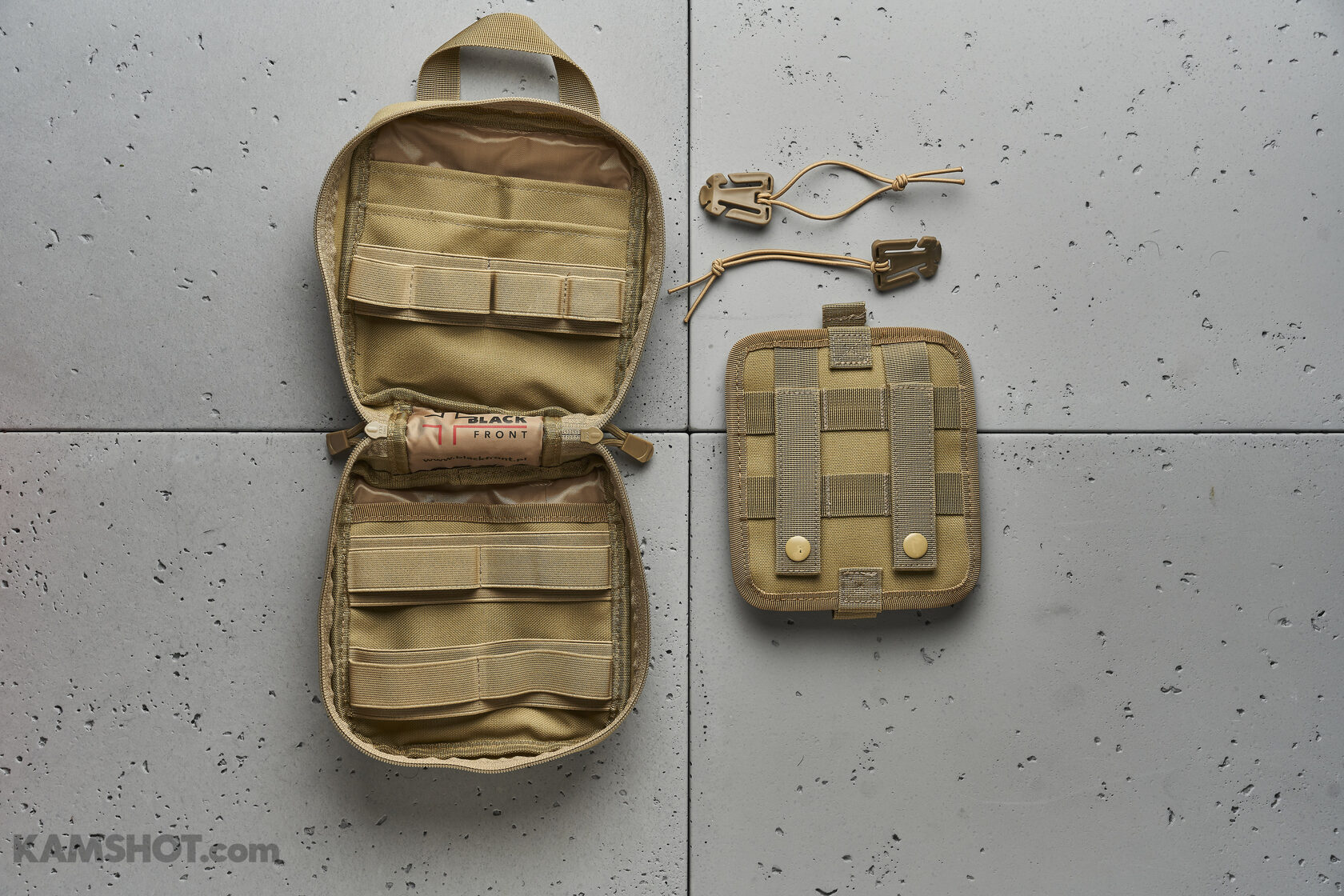 Projekt apteczki, pozwala spakować podstawowe wyposażenie medyczne strzelca. Rozmiar apteczki umożliwia spakowanie w dedykowanej kieszeni dwóch opatrunków wentylowych marki Black Front tak by nie było konieczności ich "łamania" na pół.