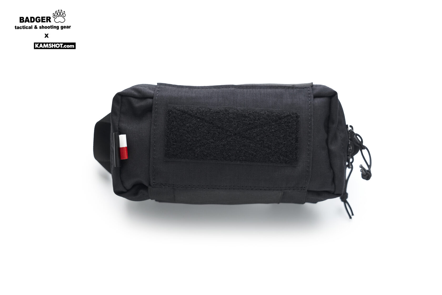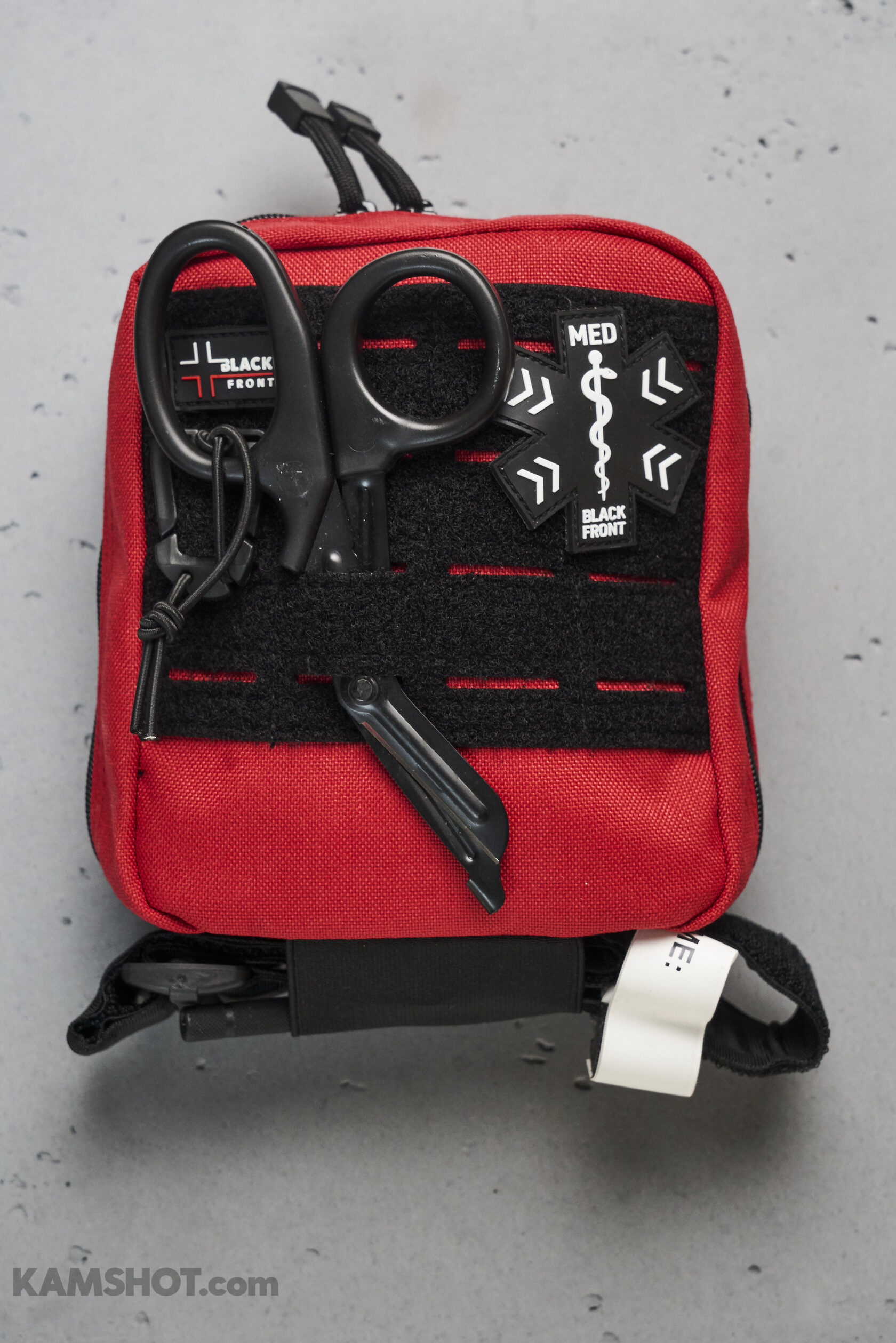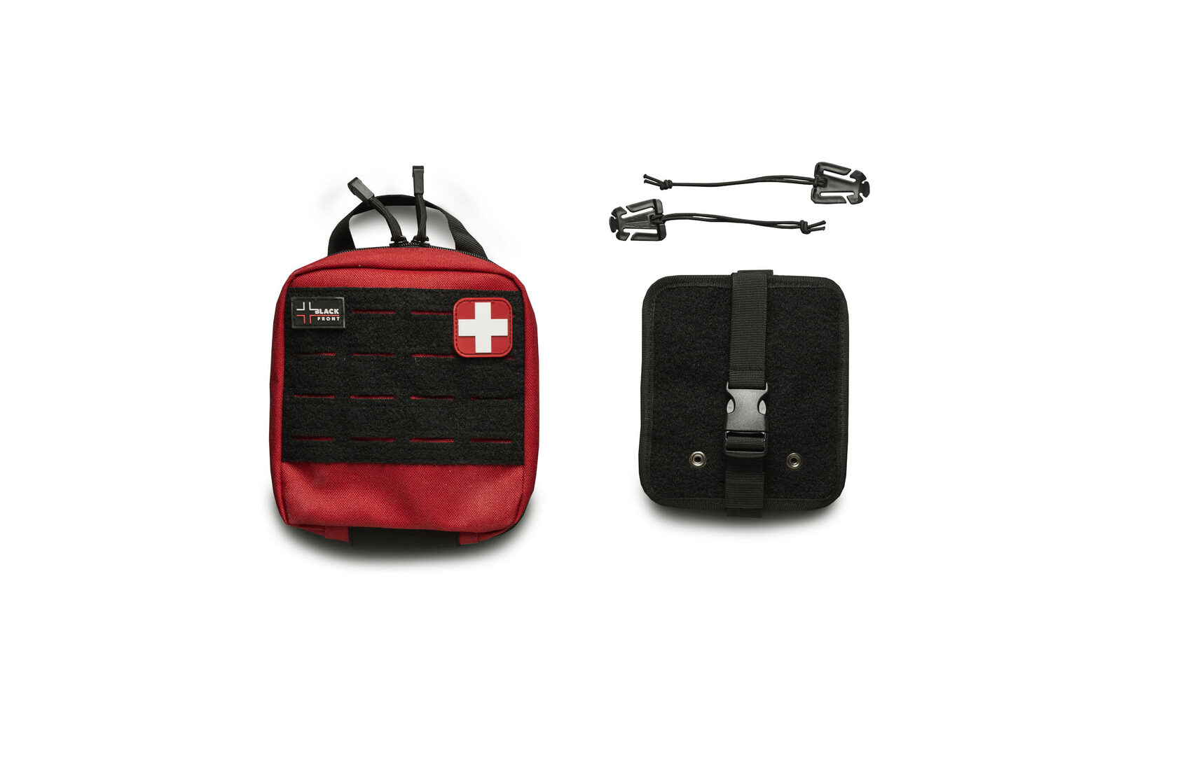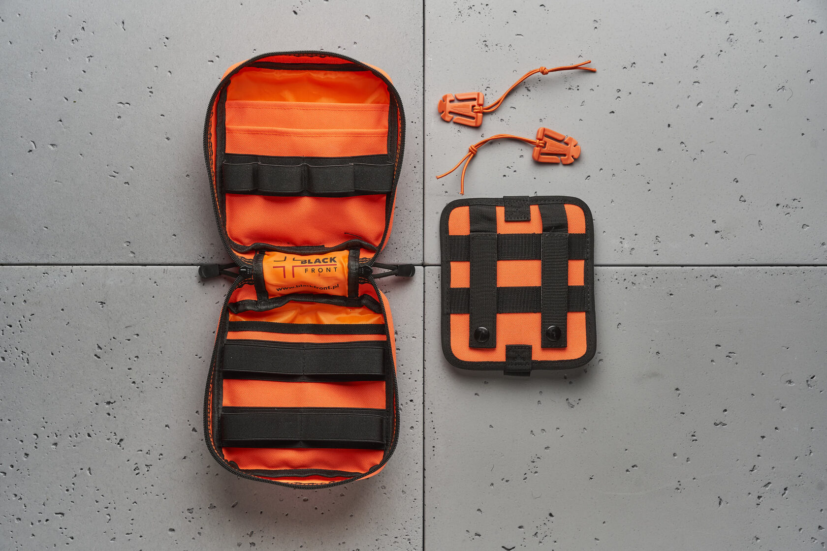 Projekt apteczki, pozwala spakować podstawowe wyposażenie medyczne strzelca. Rozmiar apteczki umożliwia spakowanie w dedykowanej kieszeni dwóch opatrunków wentylowych marki Black Front tak by nie było konieczności ich "łamania" na pół.