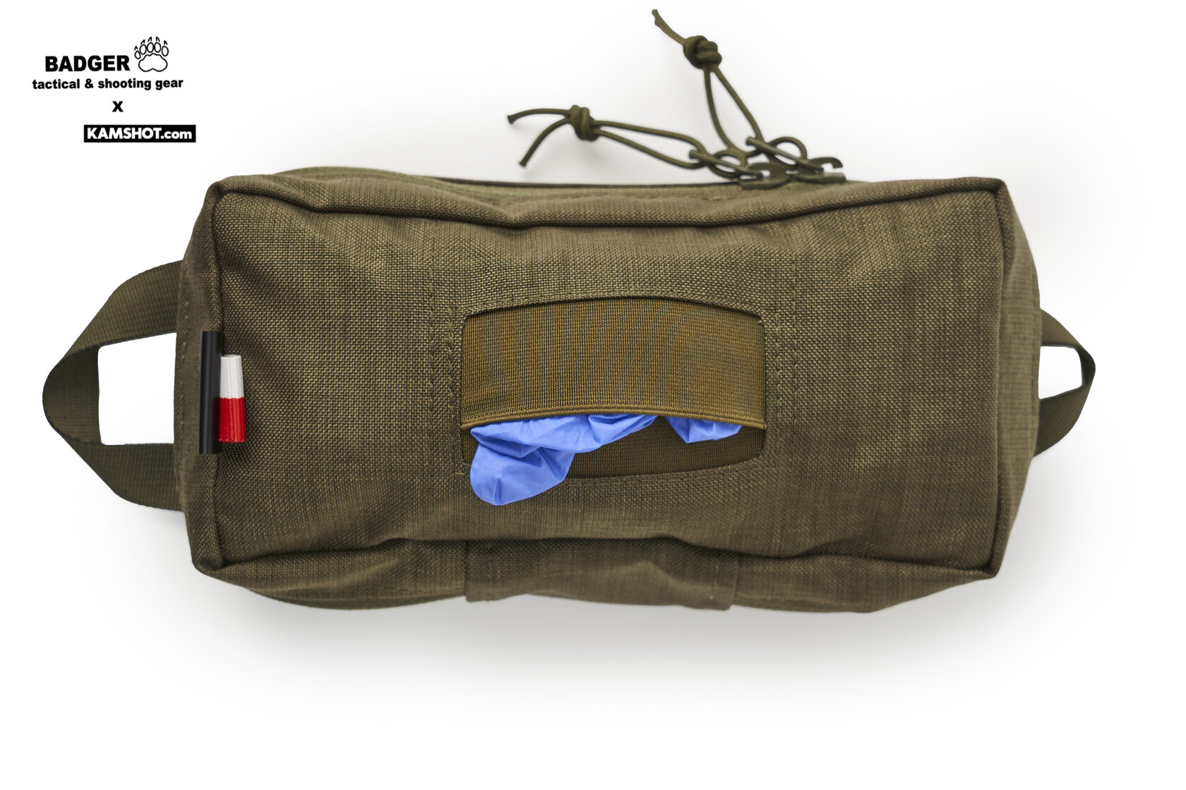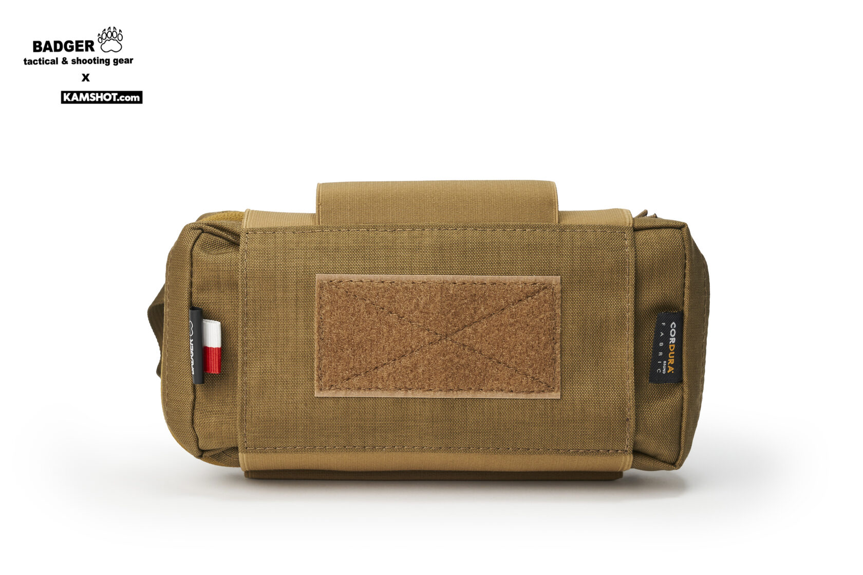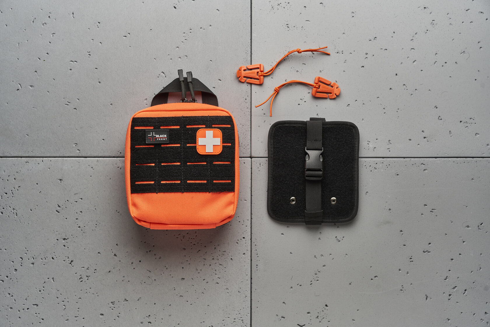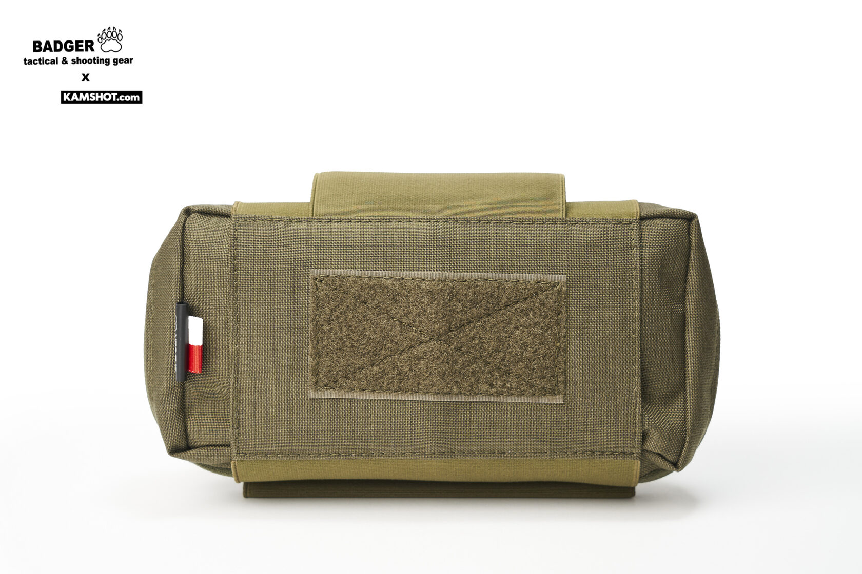 Projekt apteczki, pozwala spakować podstawowe wyposażenie medyczne strzelca. Rozmiar apteczki umożliwia spakowanie w dedykowanej kieszeni dwóch opatrunków wentylowych marki Black Front tak by nie było konieczności ich "łamania" na pół.