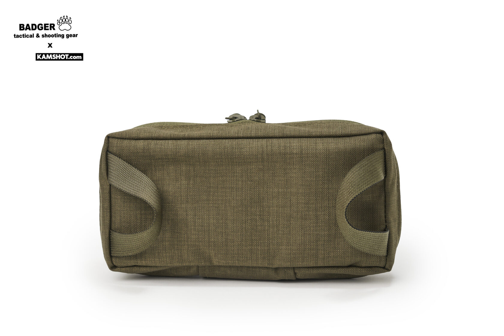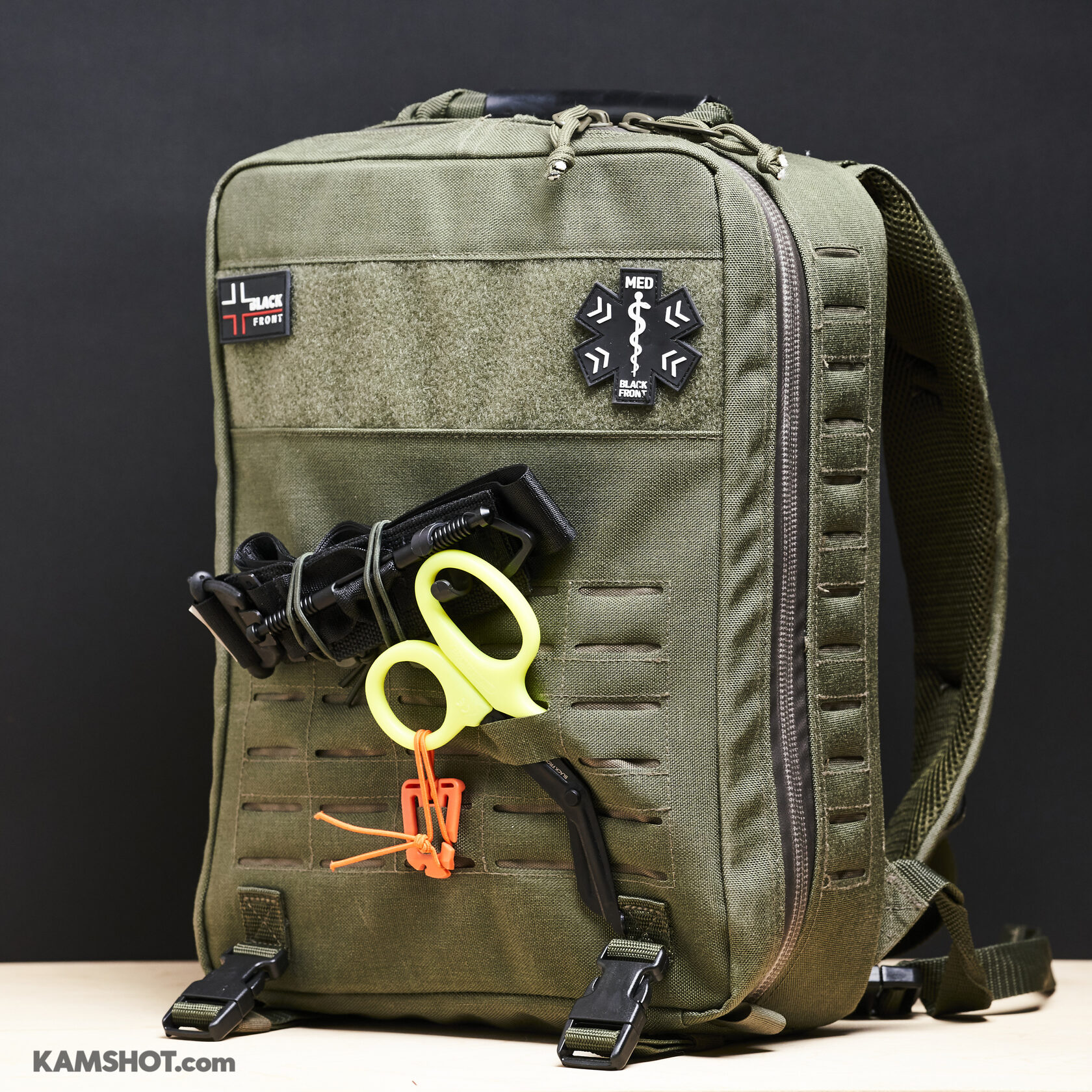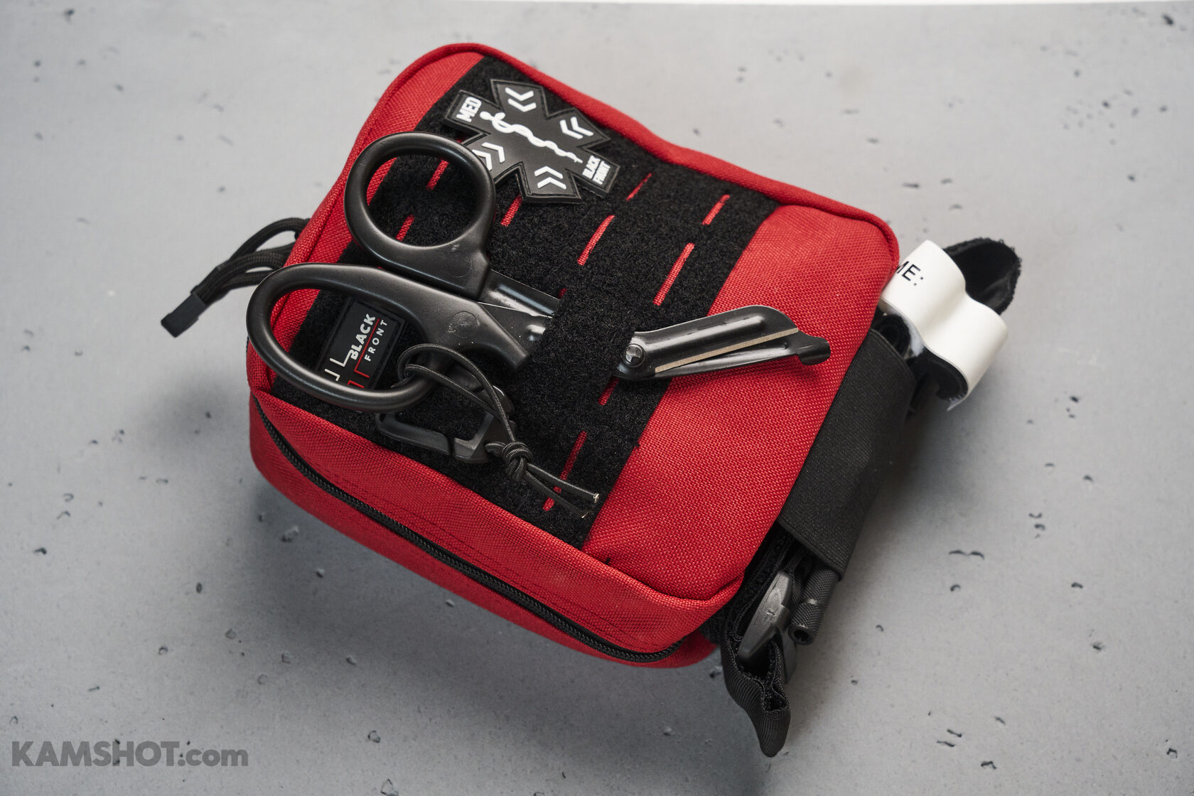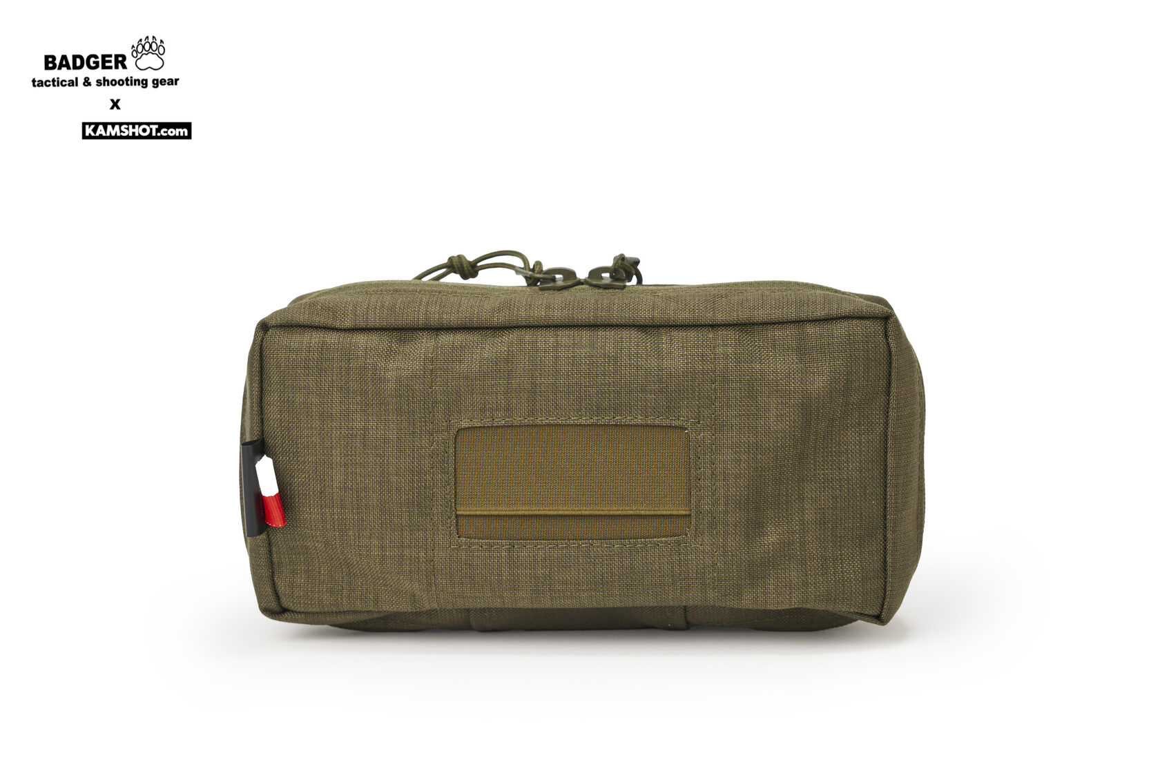 Projekt apteczki, pozwala spakować podstawowe wyposażenie medyczne strzelca. Rozmiar apteczki umożliwia spakowanie w dedykowanej kieszeni dwóch opatrunków wentylowych marki Black Front tak by nie było konieczności ich "łamania" na pół.