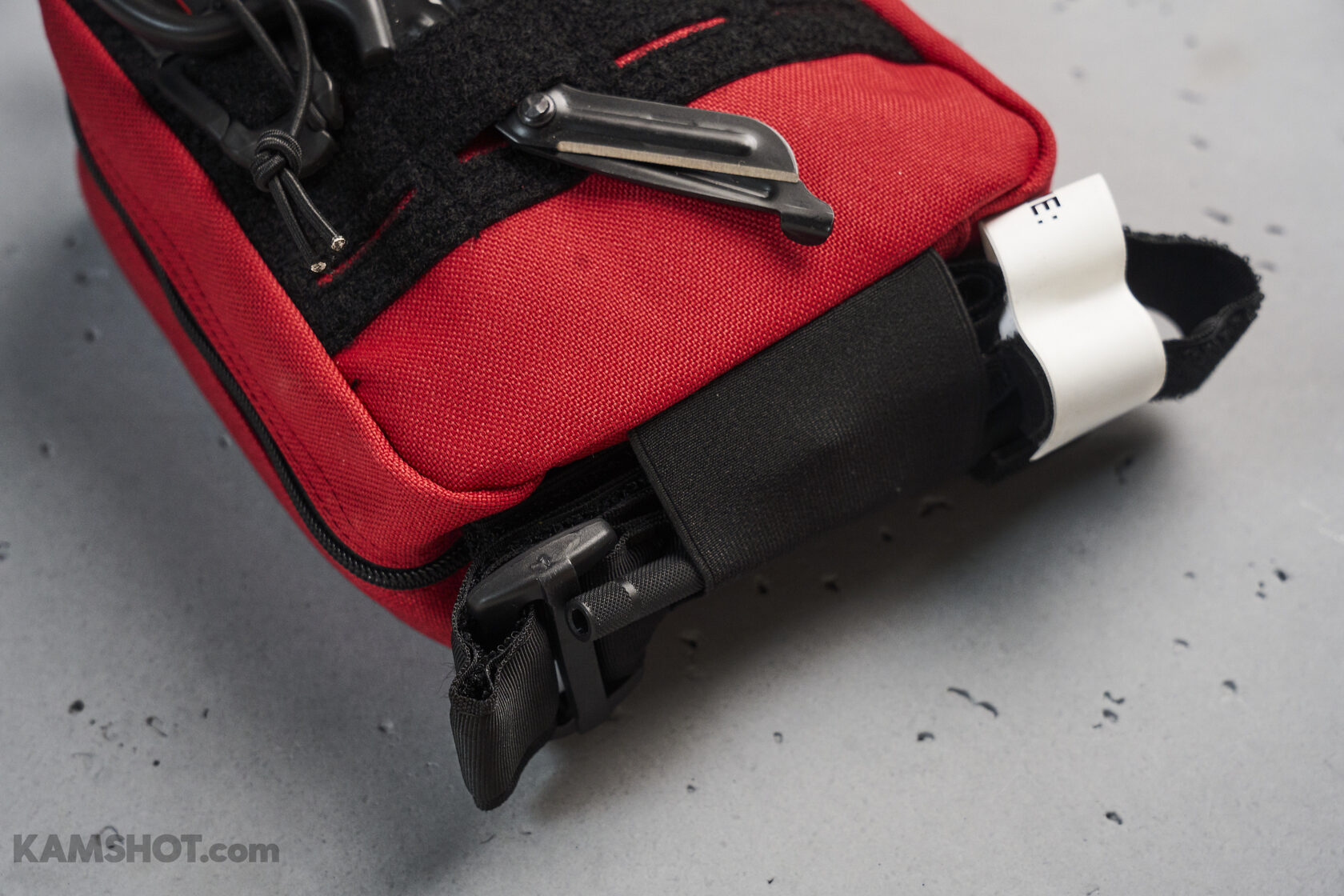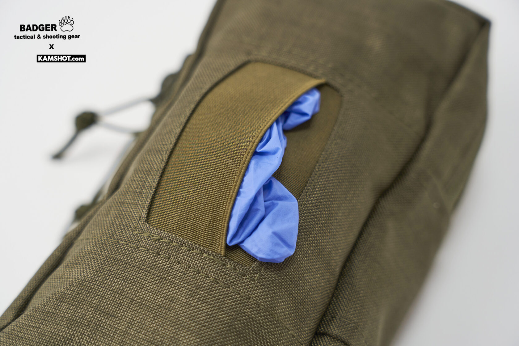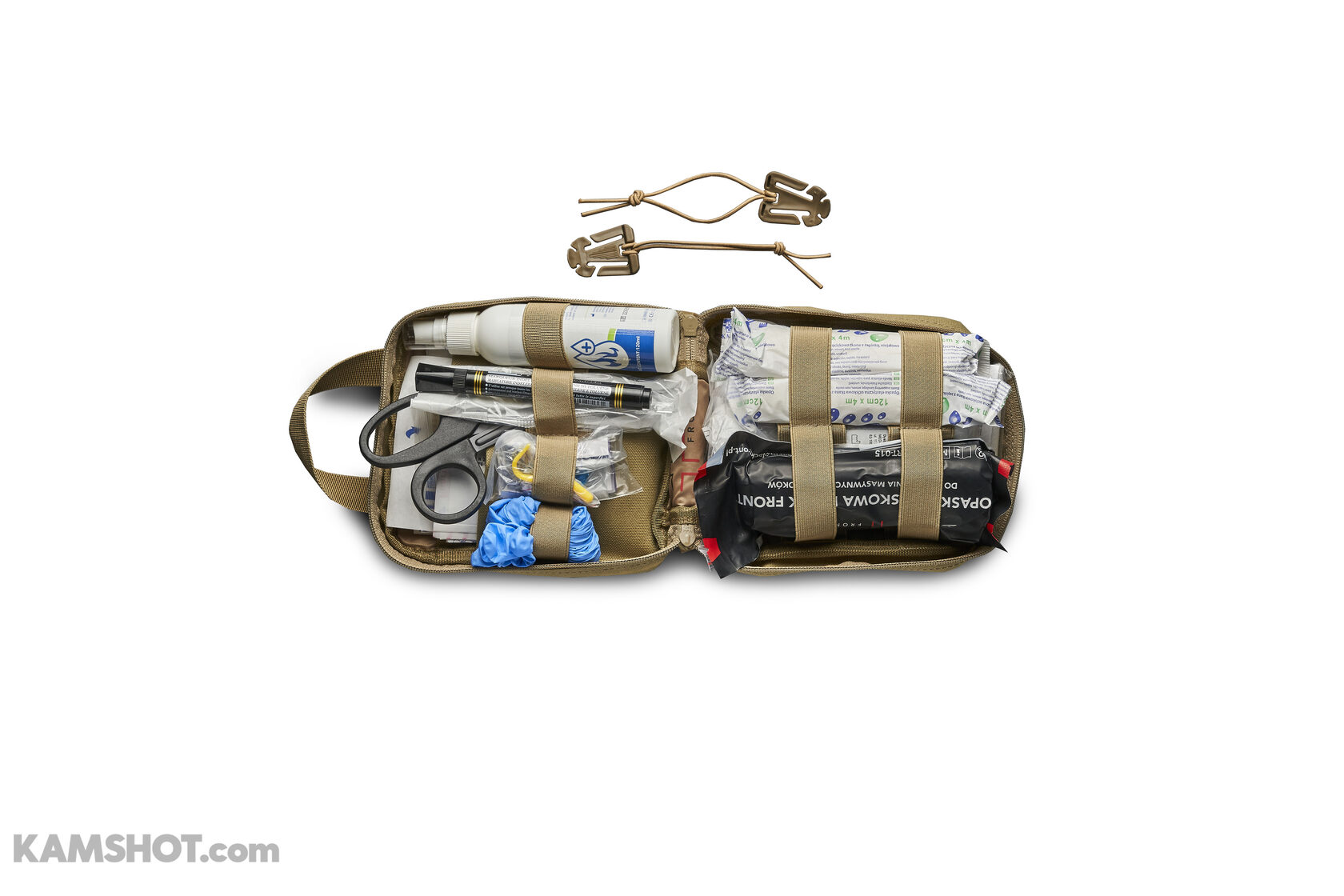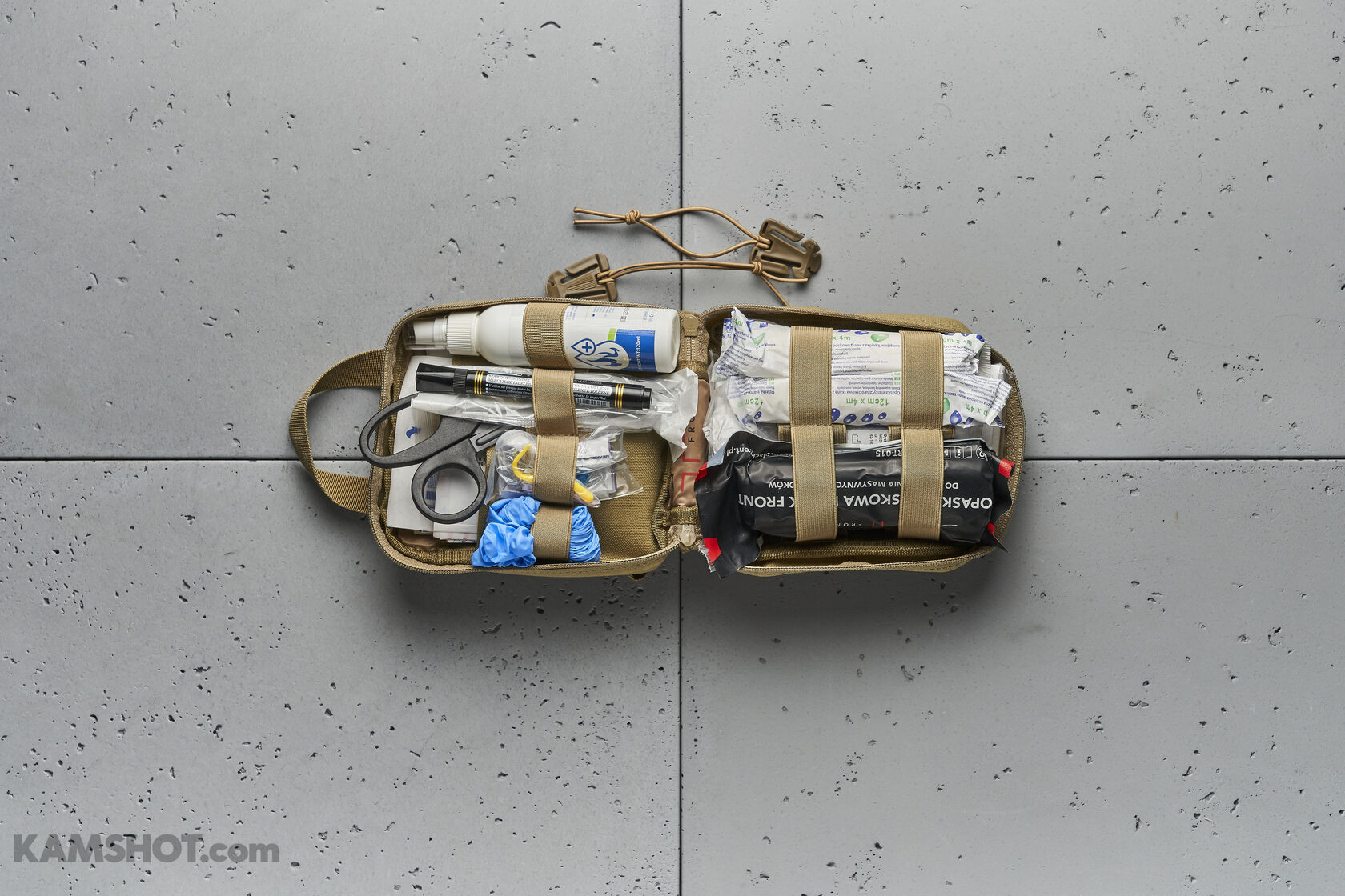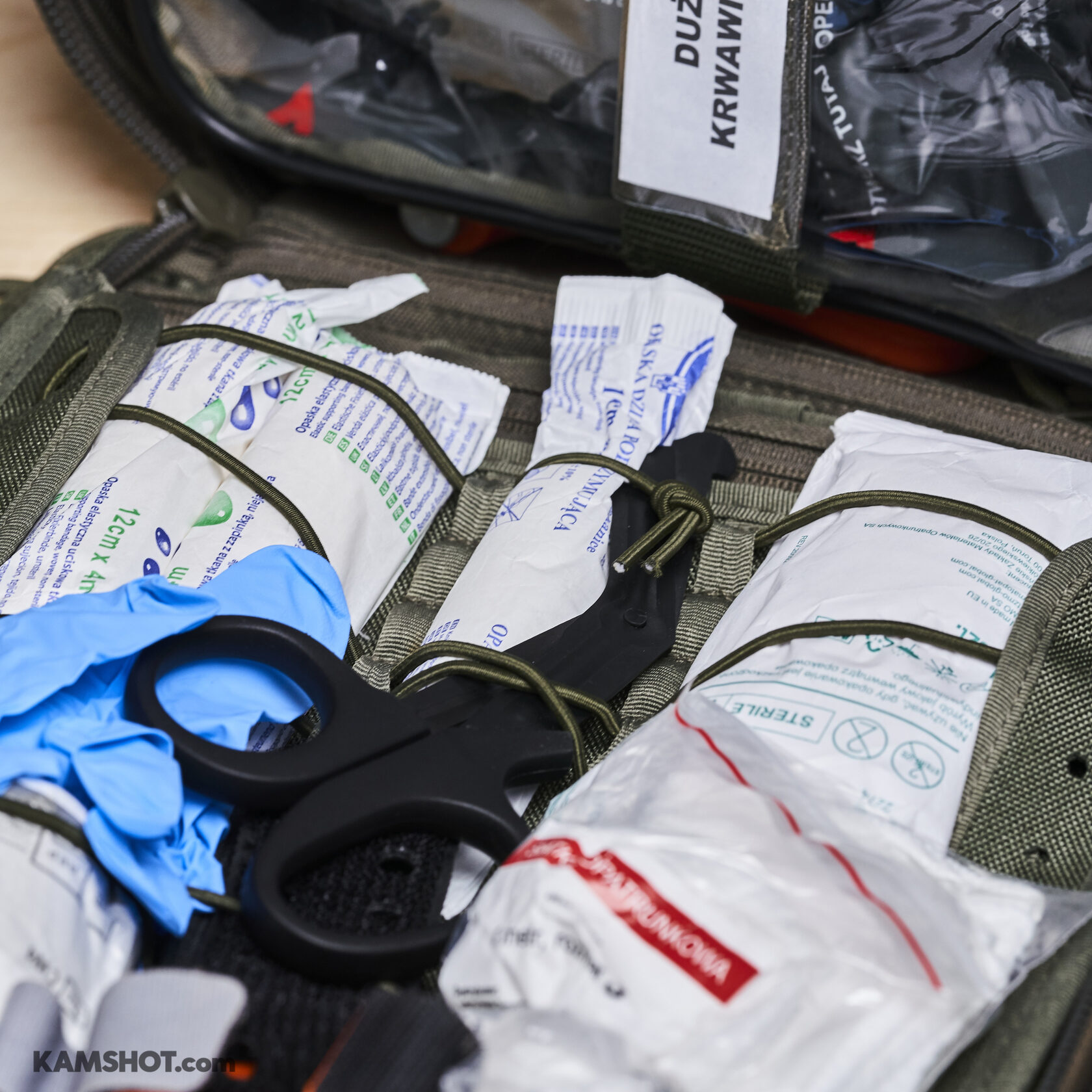 Wszyte gumy umożliwią zamontowanie takich elementów jak opatrunek indywidualny wielkości 10" lub 15", gaza wypełniająca skompresowana, opatrunek hemostatyczny, 2x opatrunek wentylowy, rurka nosowa gardłowa wraz lubrykantem, koc NRC, nożyczki ratownicze. Dodatkowa przeźroczysta kieszonka, pozwala schować właśnie niewielkie elementy wyposażenia, jak np. plastry, szwy syntetyczne, płaskie opatrunki, gaziki do dezynfekcji itd.