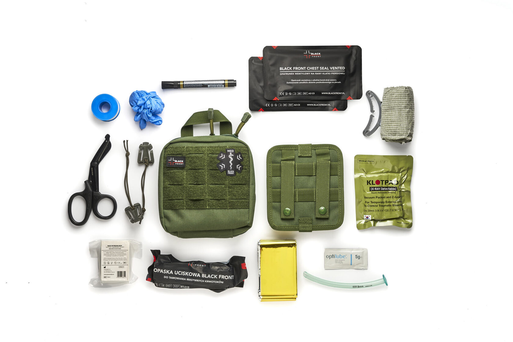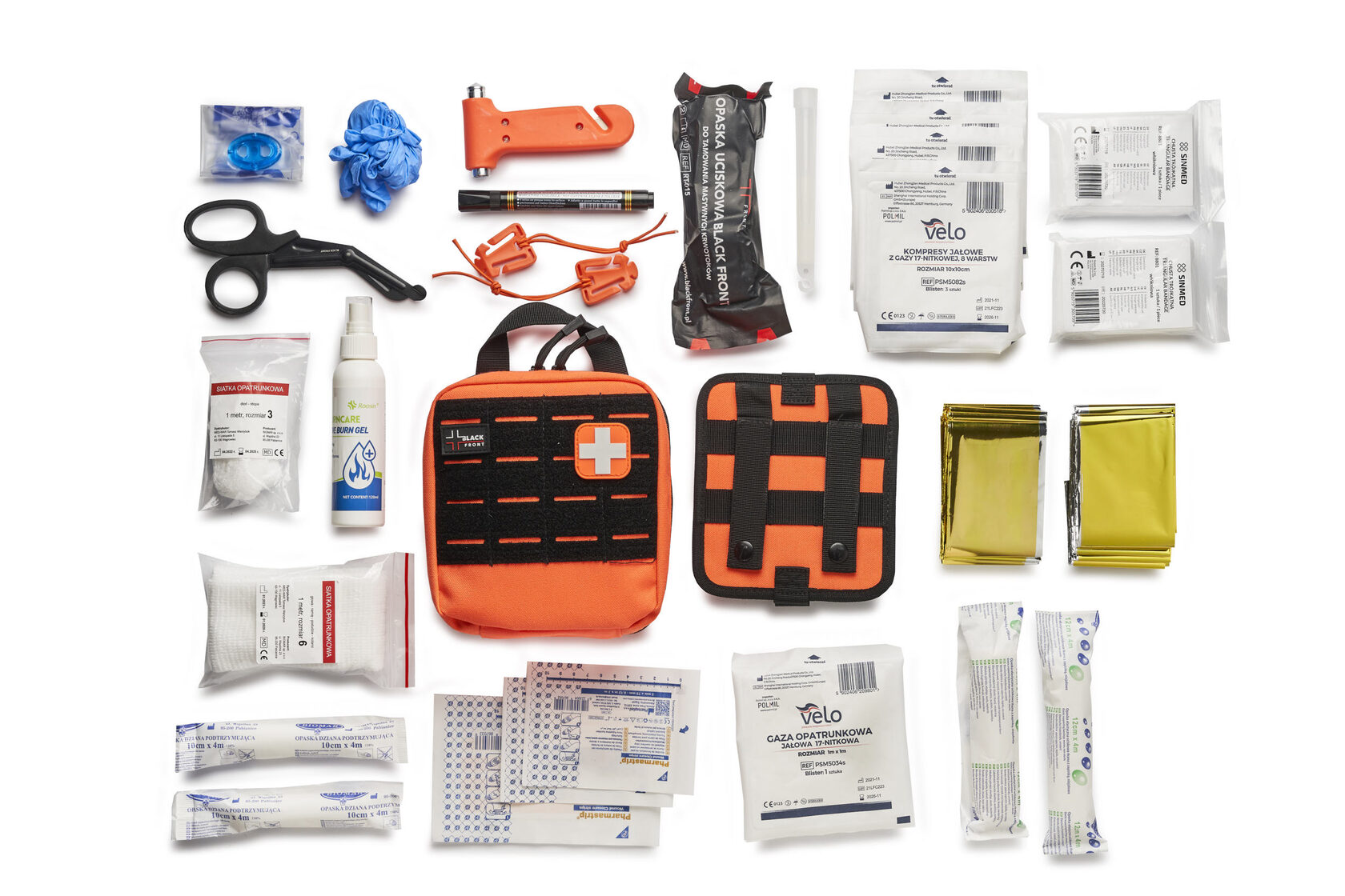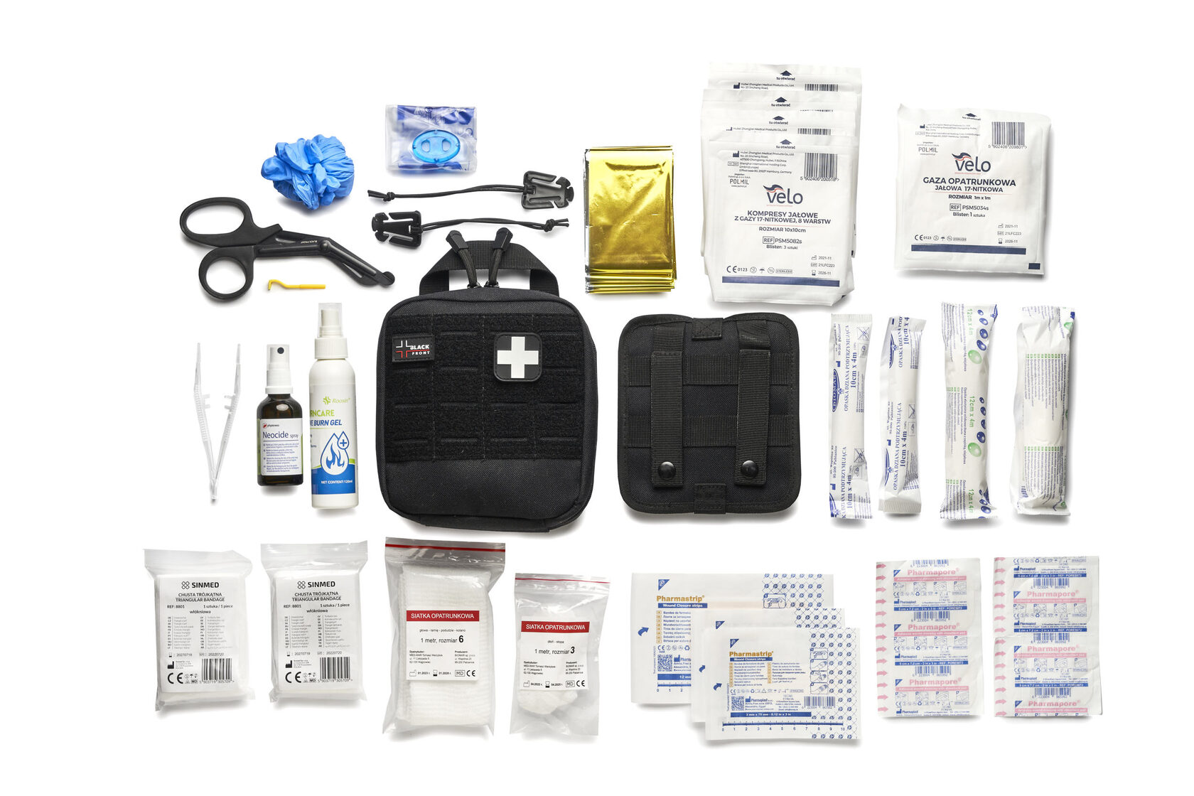 Rękawiczki diagnostyczne, nitrylowe – 4 szt. Maseczka do RKO z filtrem – 1 szt. Opatrunek z wkładem chłonnym 5 x 7,2 cm – 4 szt. Siatka opatrunkowa nr 3, długość 1 m – 1 szt. Siatka opatrunkowa nr 6, długość 1 m – 1 szt. Paski do zamykania ran 3 x 75 mm – 1 blister Paski do zamykania ran 12 x 100 mm – 1 blister Plaster z opatrunkiem – 3 szt. Pęseta jednorazowa – 1 szt. Chusta trójkątna bawełniana – 1 szt. Nożyczki ratownicze Black Front Standard – 1 szt. Opaska elastyczna 12 cm x 4 m – 2 szt. Opaska dziana 10 cm x 4 m – 2 szt. Gaza opatrunkowa jałowa 1 m² – 1 szt. Kompres gazowe jałowe 10 x 10 cm – 4 szt. Koc ratunkowy NRC (folia izotermiczna) – 1 szt. Żel schładzający o pojemności 120ml – 1 szt. Kleszczołapki – 1 szt. Płyn do dezynfekcji ran i błon śluzowych NEOCIDE 50 ml – 1 szt. Apteczka wraz z panelem rzepowym systemu Molle – 1 szt. Gumki (troki) mocujące szybkiego montażu – 2 szt.