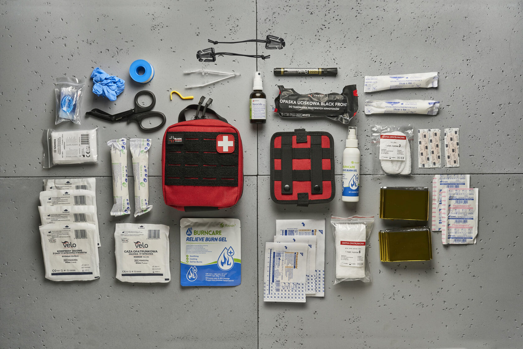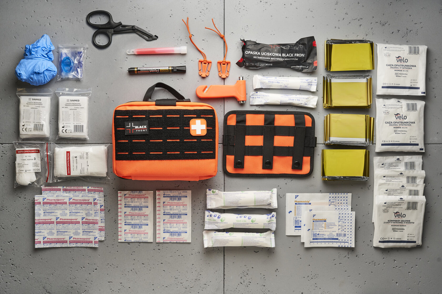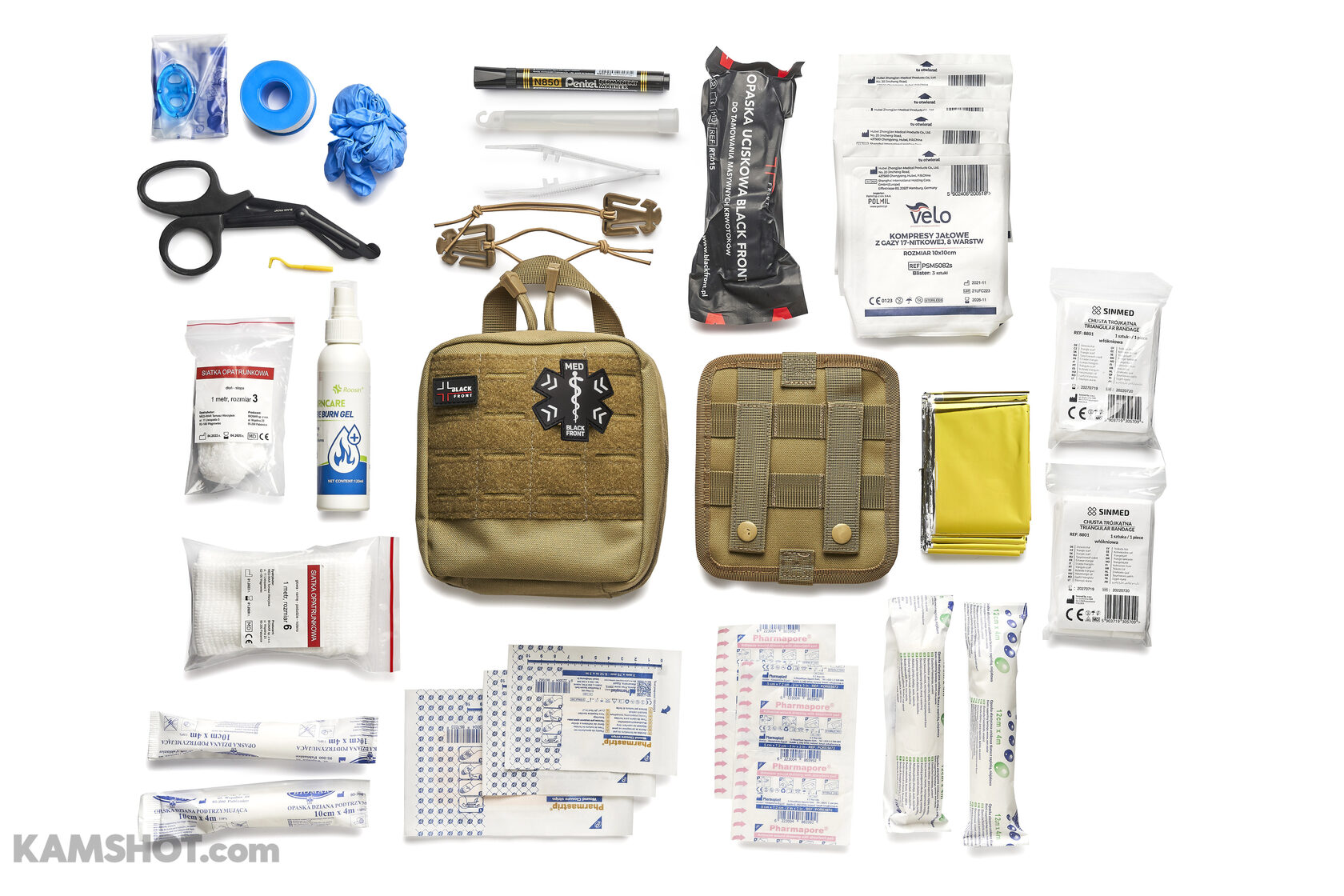 Rękawiczki diagnostyczne, nitrylowe – 4 szt. Maseczka do RKO z filtrem – 1 szt. Opatrunek z wkładem chłonnym 5 x 7,2 cm – 4 szt. Siatka opatrunkowa nr 3, długość 1 m – 1 szt. Siatka opatrunkowa nr 6, długość 1 m – 1 szt. Paski do zamykania ran 3 x 75 mm – 1 blister Paski do zamykania ran 12 x 100 mm – 1 blister Plaster z opatrunkiem – 3 szt. Pęseta jednorazowa – 1 szt. Chusta trójkątna bawełniana – 1 szt. Nożyczki ratownicze Black Front Standard – 1 szt. Opaska elastyczna 12 cm x 4 m – 2 szt. Opaska dziana 10 cm x 4 m – 2 szt. Gaza opatrunkowa jałowa 1 m² – 1 szt. Kompres gazowe jałowe 10 x 10 cm – 4 szt. Koc ratunkowy NRC (folia izotermiczna) – 1 szt. Żel schładzający o pojemności 120ml – 1 szt. Kleszczołapki – 1 szt. Płyn do dezynfekcji ran i błon śluzowych NEOCIDE 50 ml – 1 szt. Apteczka wraz z panelem rzepowym systemu Molle – 1 szt. Gumki (troki) mocujące szybkiego montażu – 2 szt.