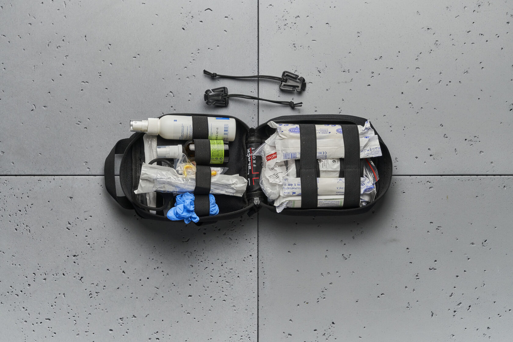 w zewnętrznej gumowej kieszonce szybkiego dostępu możemy schować 4x rękawiczki nitrylowe. Czyli coś od czego powinniśmy zacząć udzielanie pierwszej pomocy.